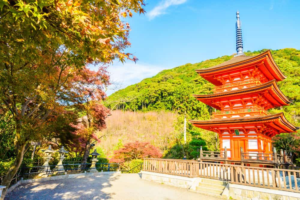 “מקדש המים הטהורים” ממוקם על צלע הר ומשקיף על נוף פנורמי של העיר. הוא מפורסם בזכות מרפסת העץ הענקית שלו, שנבנתה ללא שימוש במסמר אחד ונתמכת על ידי 139 עמודי עץ אדירים. הביטוי היפני “לקפוץ מהבמה של קיומיזו” מקביל לביטוי “לקפוץ למים העמוקים” ומעיד על גובהה המרשים. מתחת למרפסת נובע מפל אוטווה, המחולק לשלושה זרמים. האמונה היא ששתייה מהם מעניקה בריאות, אריכות ימים והצלחה בלימודים.